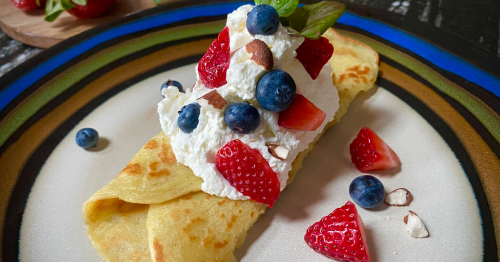 - Serve by folding the crepe and topping it with about 1/3 cup whipped cream and a handful of fresh berries.