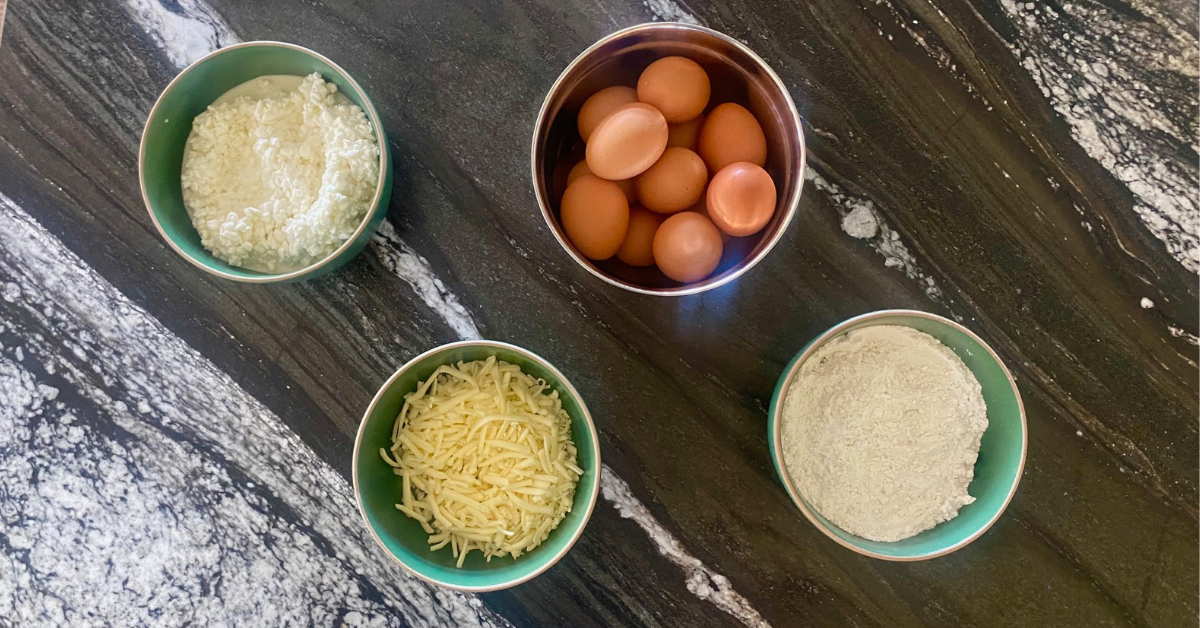 - Beat the eggs with a whisk and add them to a large bowl with the shredded cheese, flour, baking powder and cottage cheese and Tabasco sauce (if using) and mix throughly.