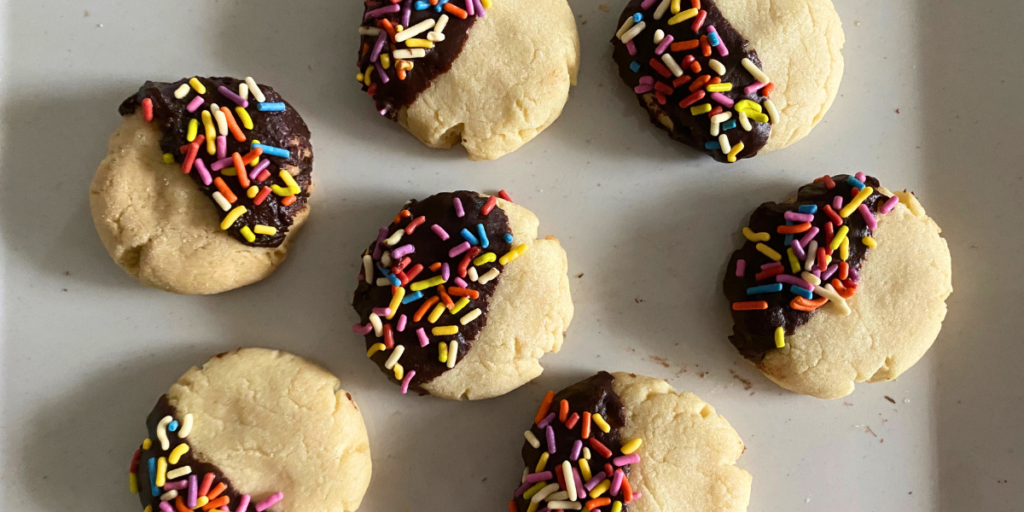 Soft, buttery, and perfectly crumbly, these Chocolate Dipped Sprinkle Butter Cookies are the festive holiday treat you’ll bake on repeat. Each soft butter cookie is dipped in creamy melted chocolate and finished with colorful sprinkles—making them perfect for the holiday season, Christmas cookie trays, cookie exchanges, gifting, or anytime you want a butter cookie recipe that looks bakery-beautiful. Bake a double batch because they will dissapper quickly!