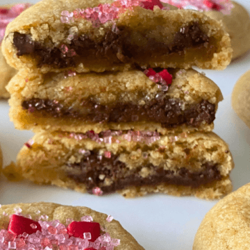 Chocolate Stuffed Valentine Sugar Cookies are thick, soft, and chewy with a gooey melted chocolate center, finished with festive Valentine’s Day sprinkles. These cookies are fun, bakery-style, and always disappear fast.