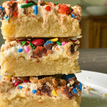 Marshmallow M&M Crumble Sugar Cookie Bars have a layer of thick buttery cookie, topped with gooey marshmallows, hunks of chocolate chip cookies, M&M’s and rainbow sprinkles. They are a fun festive dessert for birthday parties, bbq’s, family get togethers or just a treat for yourself.