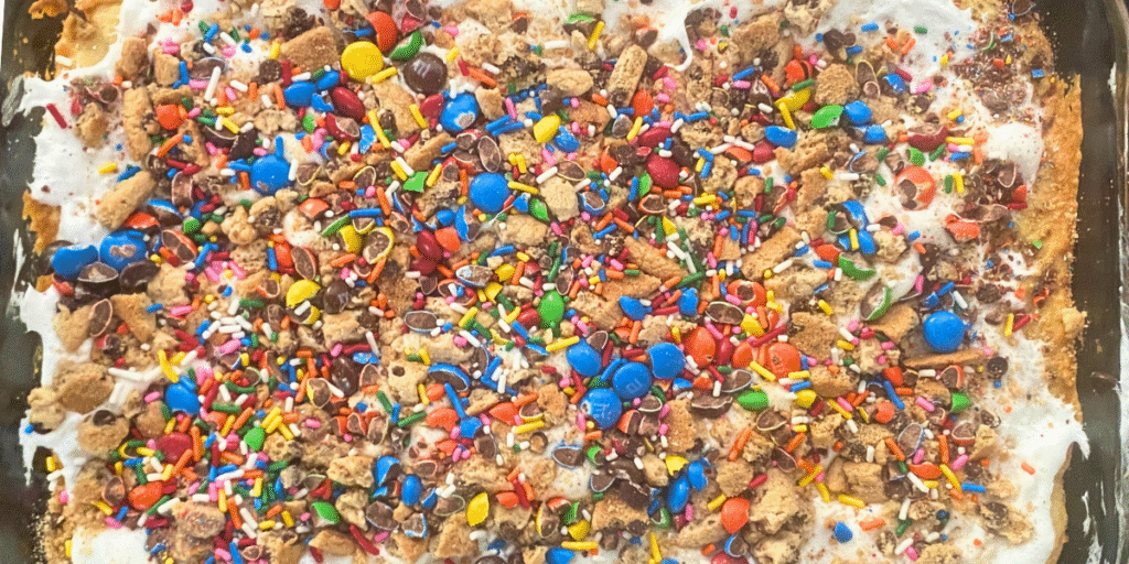 • While the marshmallows are still warm, drop the cookie chunks over the top evenly, pressing them into the warm marshmallows. Then sprinkle m&m's and add the sprinkles over the top, pushing down into the marshmallow topping.
