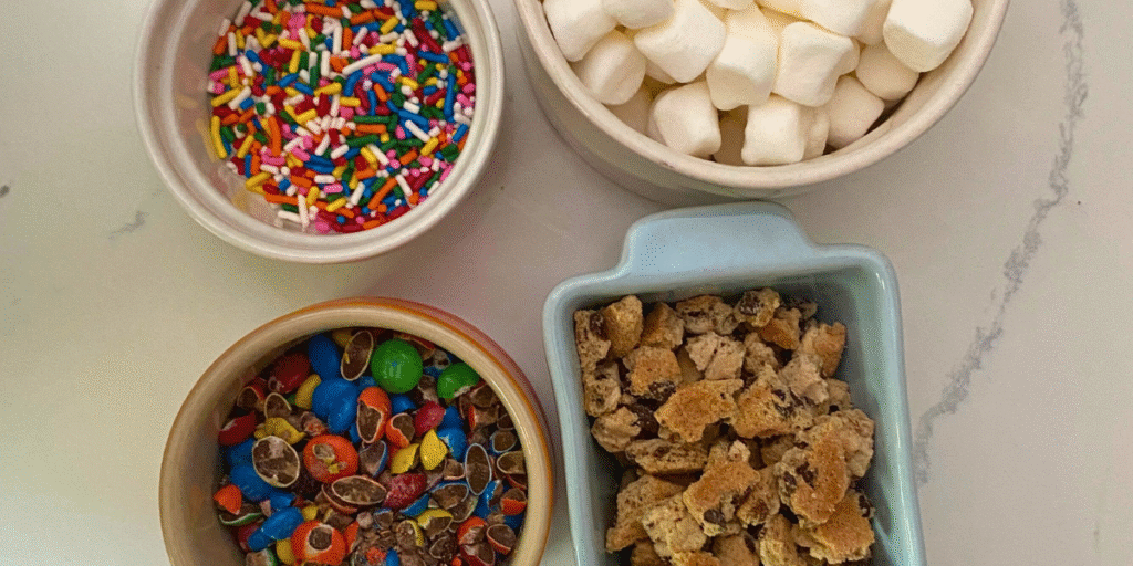 • While the marshmallows are still warm, place the cookie chunks over the top. Then add the m&m’s and sprinkles to the top. Gently press into the marshmallow mixture, and allow to cool for 15 minutes