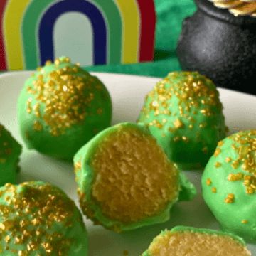 These fun St. Patty’s Lucky Day Cake Bites have a soft, creamy vanilla center, then coated in festive green-colored white chocolate, and topped with gold glitter. They’re the pot of gold at the end of the rainbow!